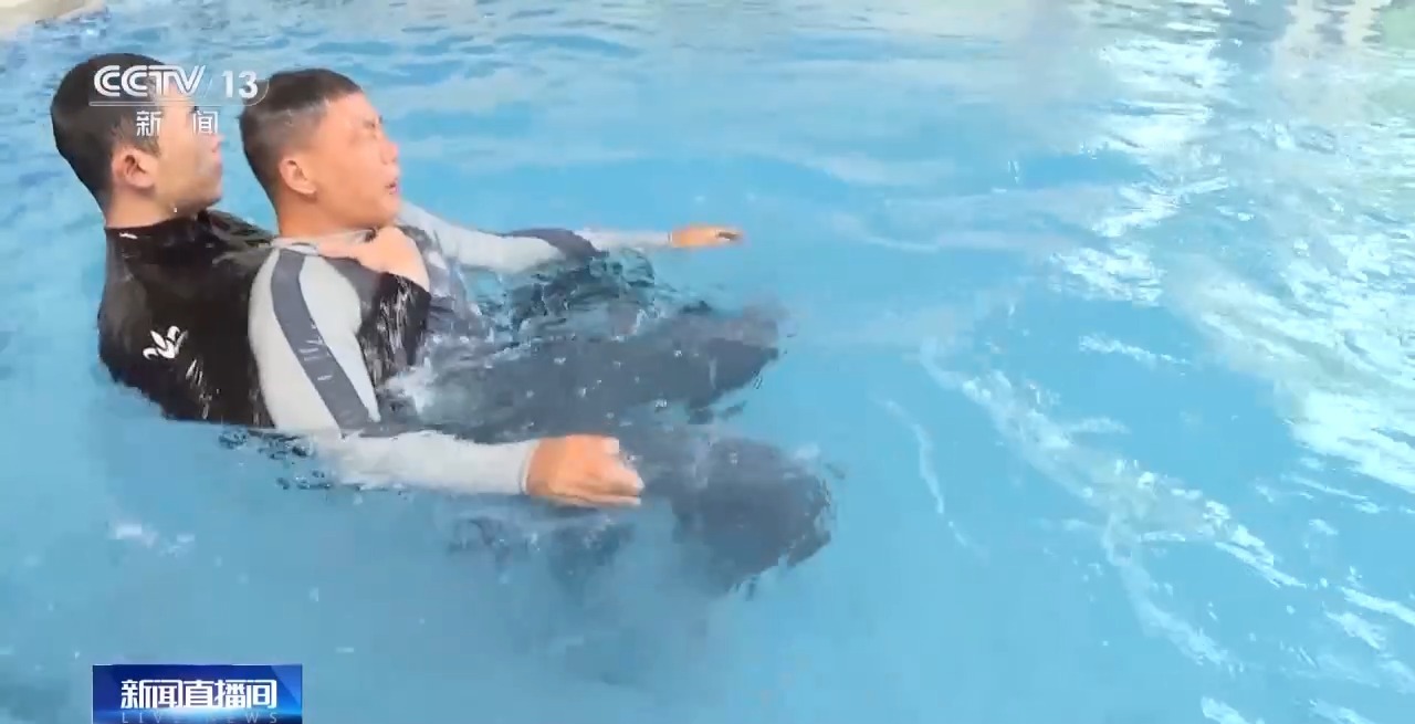 國家消防救援局水域救援訓(xùn)練基地教練員 李勝龍:我們不要正面游向他,要盡量從他的背后,然后靠近他的時(shí)候要轉(zhuǎn)動(dòng)他的髖部,使他背向我,因?yàn)槟缢咚诨艁y的時(shí)候會抓緊我們的身體,也就是我們俗稱的“抓緊最后一根稻草”。他會死死抓住我們,影響我們的救援,所以說我們要從背后接近他,然后托住他的頭部 、頸部,使他的頭部始終露出水面,降低他的恐慌。