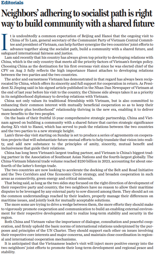 正如中國領(lǐng)導(dǎo)人去年12月在越南《人民報》發(fā)表的署名文章中所指出的,中國黨和政府始終將發(fā)展中越關(guān)系視為中國周邊外交的優(yōu)先方向,衷心希望兩國不忘傳統(tǒng)友好初心,牢記共同理想使命,攜手走好社會主義道路,不斷推動構(gòu)建具有戰(zhàn)略意義的命運(yùn)共同體。