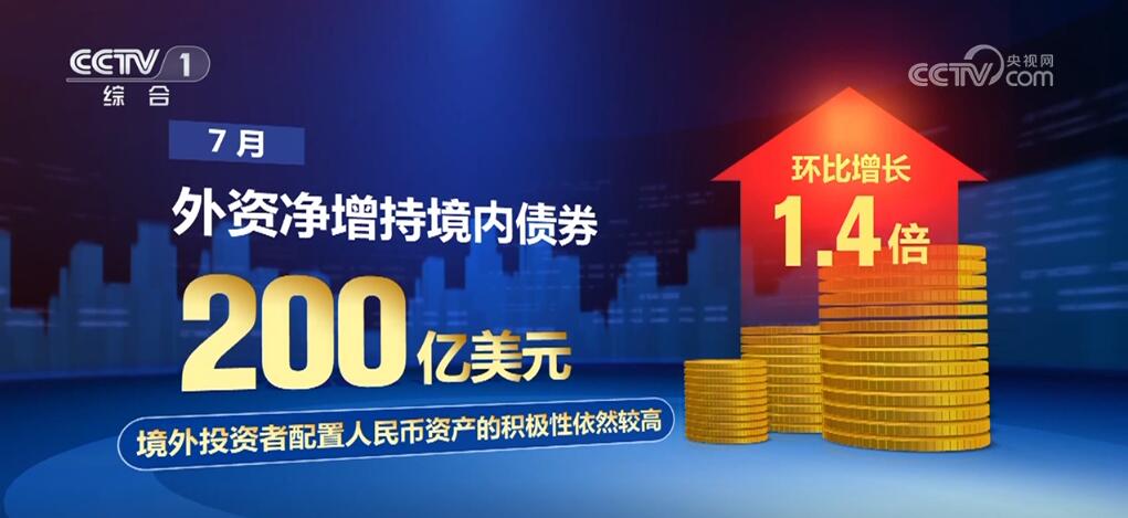 國家外匯管理局數(shù)據顯示,7月,外資凈增持境內債券200億美元,環(huán)比增長1.4倍。境外投資者配置人民幣資產的積極性依然較高。
