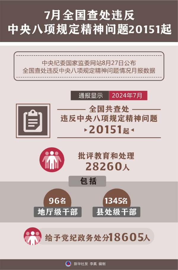 中央紀委國家監(jiān)委網站27日公布全國查處違反中央八項規(guī)定精神問題情況月報數(shù)據。通報顯示,今年7月,全國共查處違反中央八項規(guī)定精神問題20151起,批評教育和處理28260人(包括96名地廳級干部、1345名縣處級干部),給予黨紀政務處分18605人。