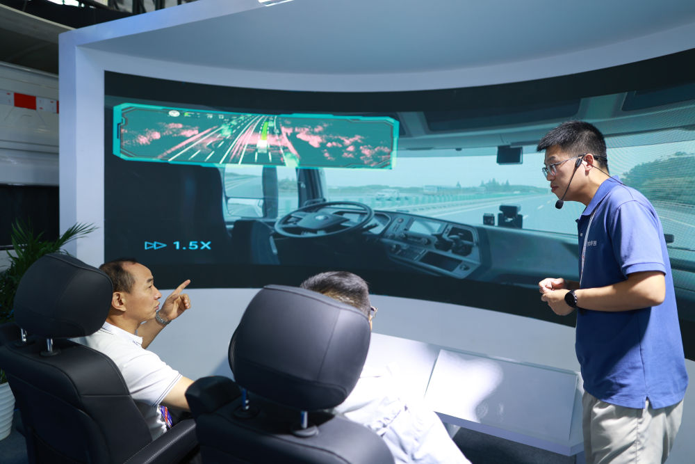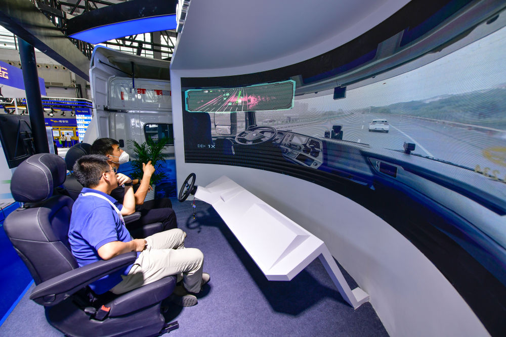 8月28日,工作人員在數(shù)博會上播放無人駕駛重型卡車上路行駛視頻。