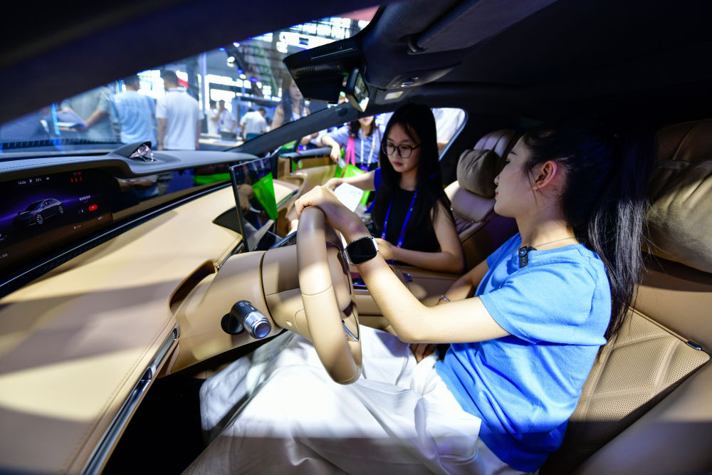 8月28日,參會人員在數(shù)博會上體驗(yàn)新能源智能駕駛汽車。