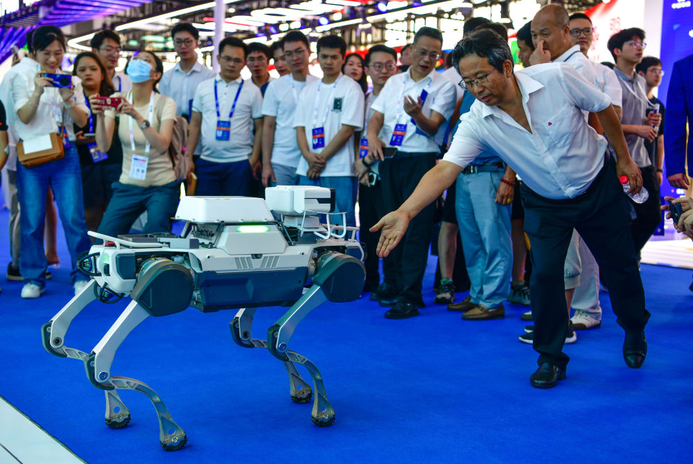 8月28日,參會人員在數(shù)博會上與機(jī)器狗互動。