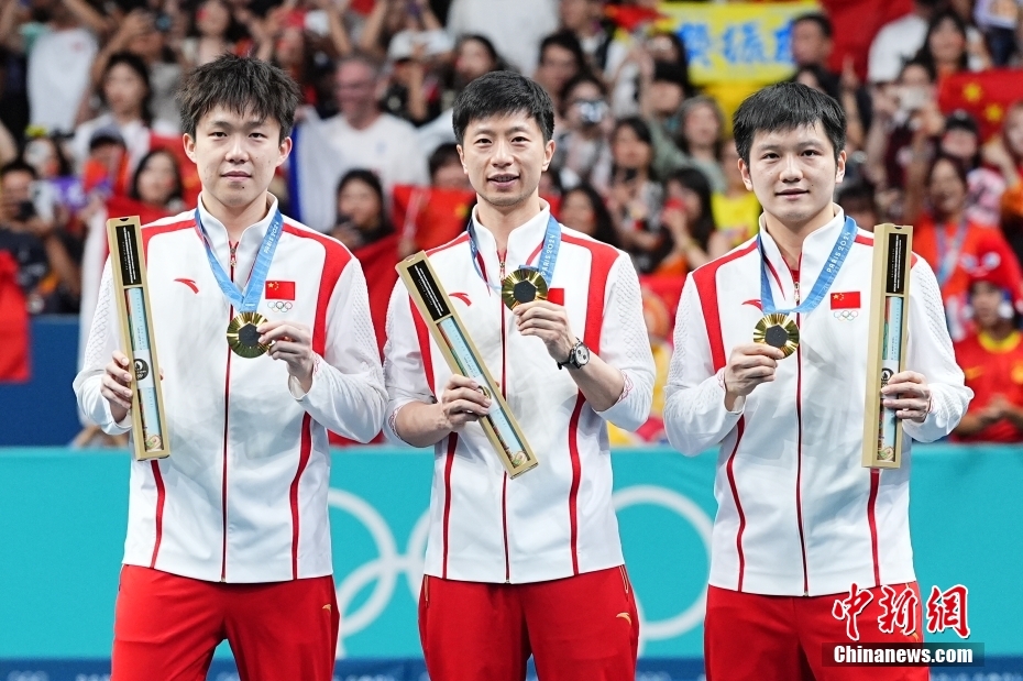 在巴黎奧運(yùn)會(huì)乒乓球男團(tuán)金牌賽中,中國(guó)隊(duì)以3比0戰(zhàn)勝瑞典隊(duì),獲得冠軍。中新社記者 趙文宇 攝