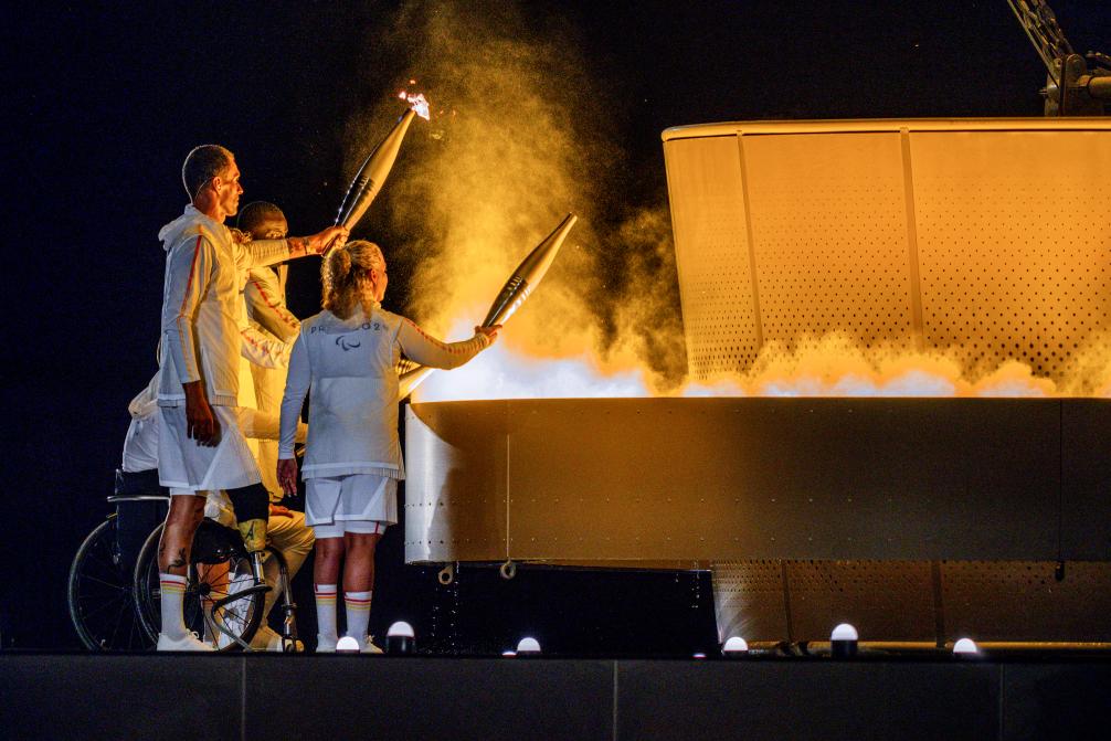 8月28日,火炬手在巴黎殘奧會開幕式上點燃主火炬。新華社記者 黃偉 攝
