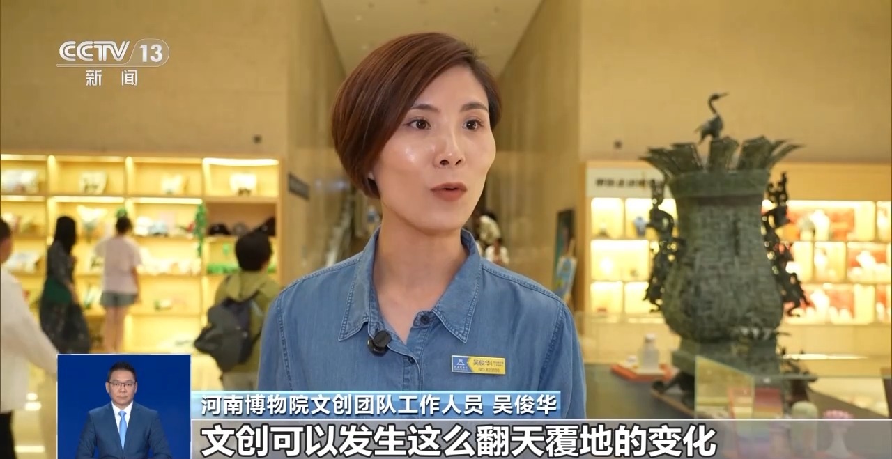 河南博物院文創(chuàng)團隊工作人員 吳俊華:大家來參觀博物館從被動灌輸,轉(zhuǎn)化為主動探索、去感受考古挖掘的樂趣以及文物的魅力。文創(chuàng)可以發(fā)生這么翻天覆地的變化,文創(chuàng)可以融入大家的衣食住行中。