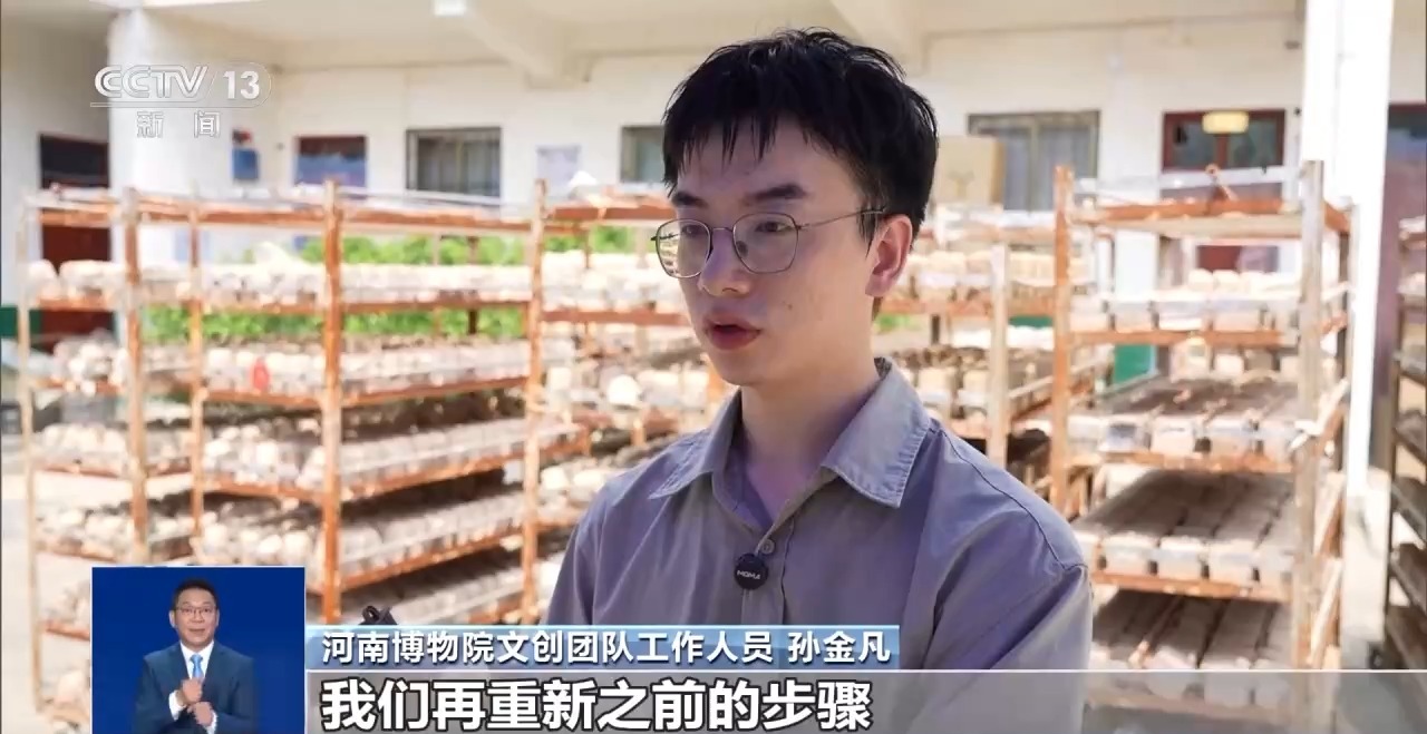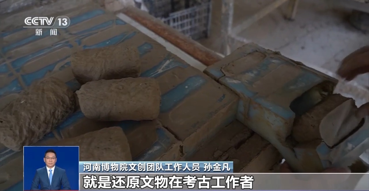 河南博物院文創(chuàng)團隊工作人員 孫金凡:和泥巴、調(diào)配方、做試驗,每天都是灰頭土臉的,就是還原文物在考古工作者出土時的那一瞬間。同學就會問,還在村里面呢?我說對,還在那和泥巴。