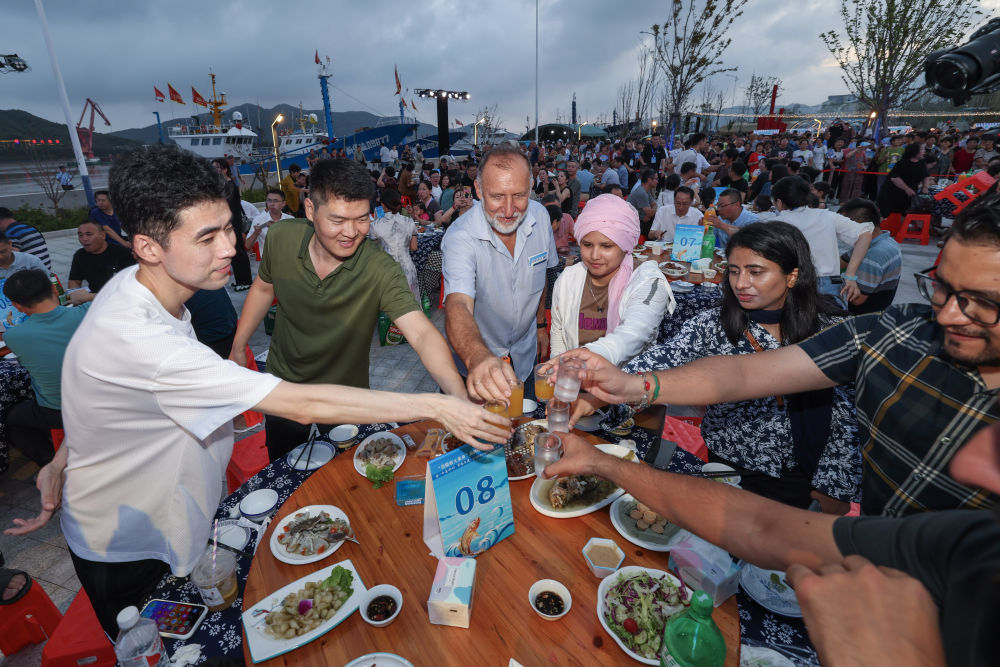 8月23日,游客在岱山縣長(zhǎng)涂鎮(zhèn)舉行的海島特色黃魚(yú)宴上舉杯。新華社記者 徐昱 攝
