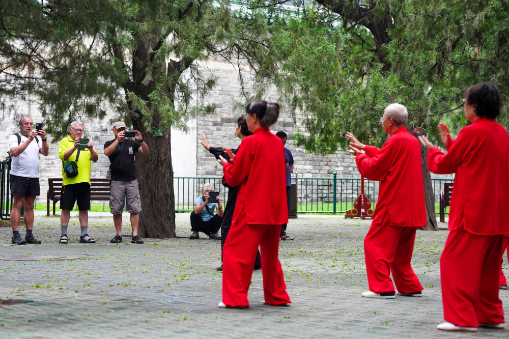 7月2日,在北京天壇公園,幾位外國(guó)游客在觀看太極拳。新華社記者 鞠煥宗 攝