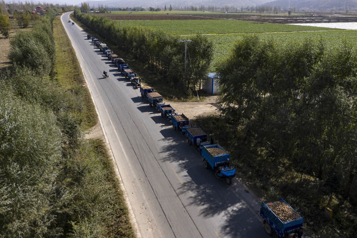 交售馬鈴薯的農(nóng)用車在寧夏固原市西吉縣馬蓮鄉(xiāng)一家淀粉廠門前排起長隊(2020年10月21日攝,無人機(jī)照片)。新華社記者 王鵬 攝