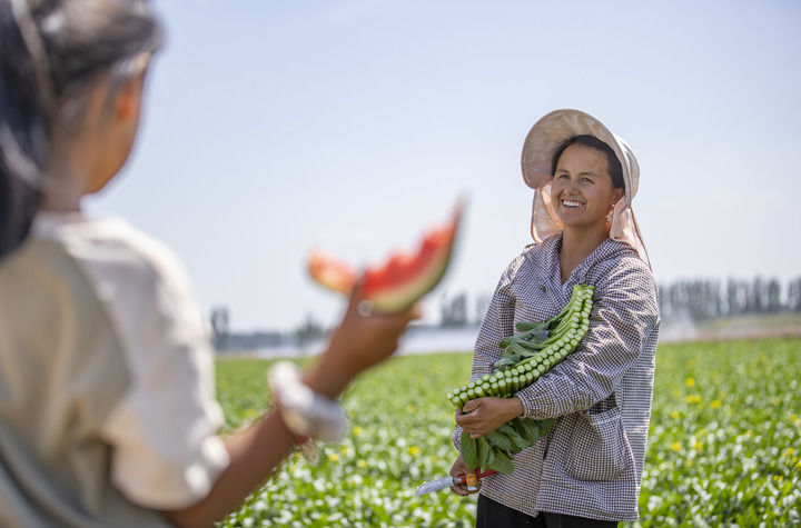 在寧夏青銅峽市瞿靖鎮(zhèn)毛橋村蔬菜基地,來自貴州的苗族務(wù)工人員楊文高(右)在采收間隙和女兒聊天(2024年8月23日攝)。新華社記者 楊植森 攝