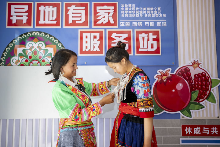 在寧夏青銅峽市瞿靖鎮(zhèn)毛橋村“異地有家”服務(wù)站,來自貴州的苗族務(wù)工人員楊文高(左)在給放暑假的大女兒整理服飾。楊文高將民族服飾從老家?guī)У綄幭?,在工作之余就會穿上民族服飾?024年8月23日攝)。新華社記者 楊植森 攝