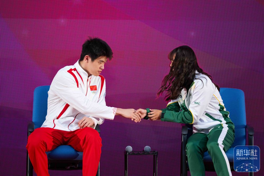 ↑9月1日,游泳運動員潘展樂(左)在活動中與澳門運動員握手交流。