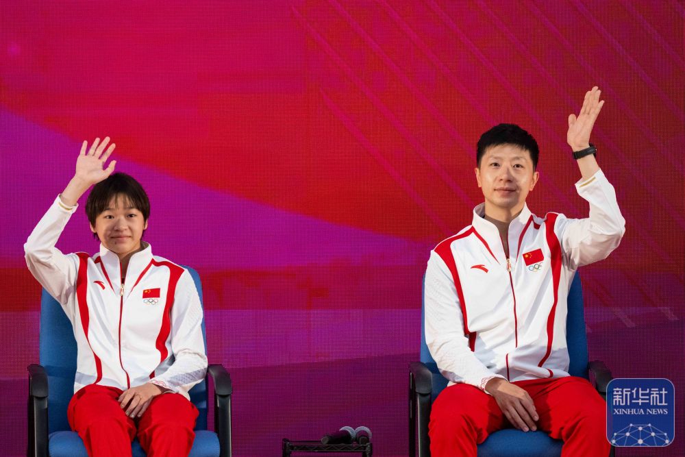↑9月1日,跳水運動員全紅嬋(左)與乒乓球運動員馬龍在活動中揮手致意。
