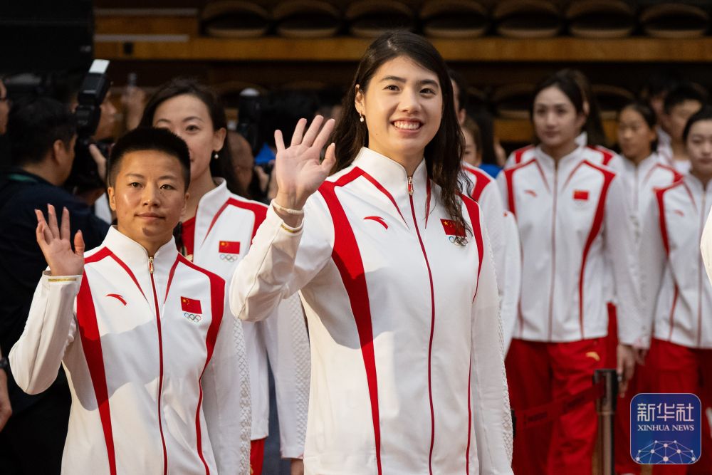 ↑9月1日,游泳運動員張雨霏(前右)在活動中揮手致意。