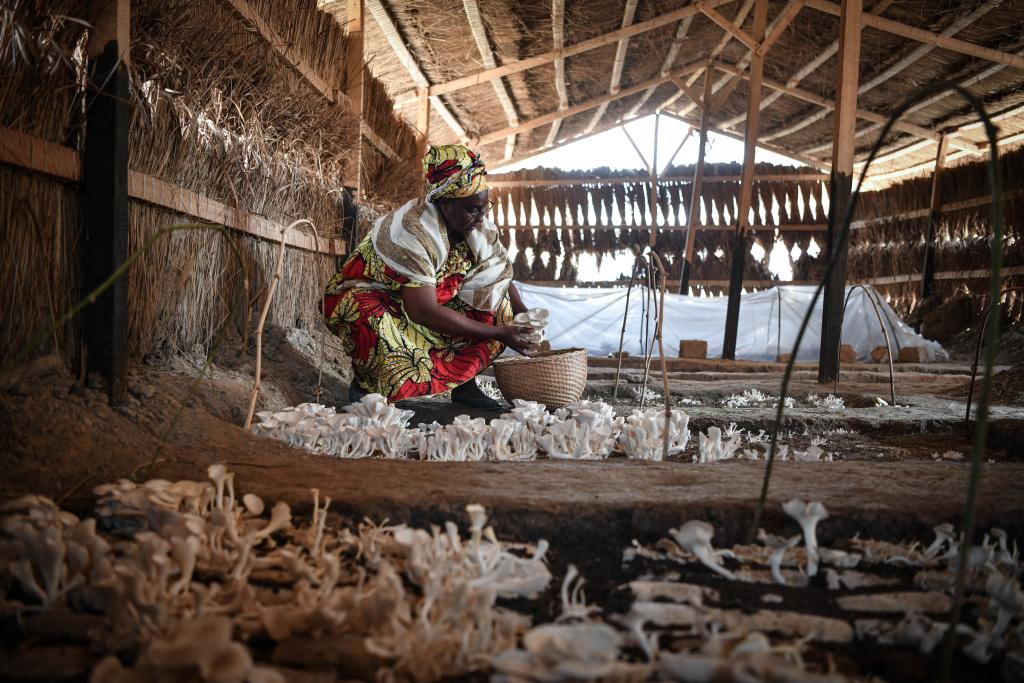 8月15日,在盧旺達首都基加利,蘇珊娜·尼庫澤在自己的菇棚內采摘鮮菇。