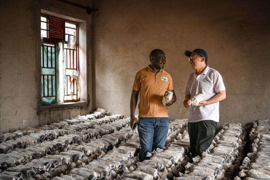 8月14日,在盧旺達南方省尼安薩區(qū)的一家食用菌培育工坊,菌草專家陳曉斌與工坊主人卡納尼·埃納尼交流。