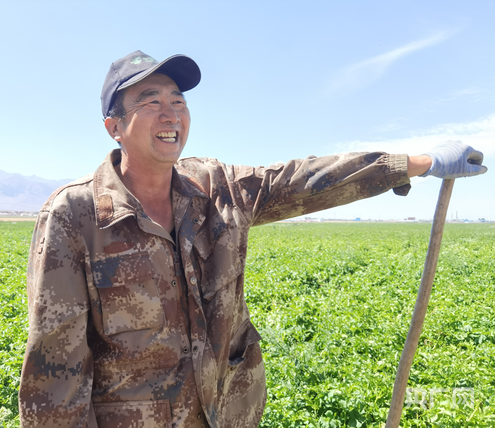 馬鈴薯種植基地管護人員高玉輝向記者介紹情況(央廣網(wǎng)記者 夏莎 攝)