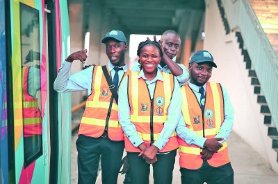 6月12日,在尼日利亞拉各斯,拉各斯輕軌藍線項目動車組列車司機組長伊莎貝拉·亞當斯·伊斯拉埃爾(中)與同事在站臺上合影。新華社發(fā)