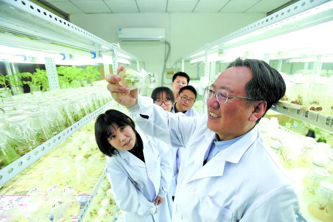 沈陽農(nóng)業(yè)大學教授李天來院士在實驗室指導研究生開展科研,觀察番茄遺傳轉(zhuǎn)化過程等情況。