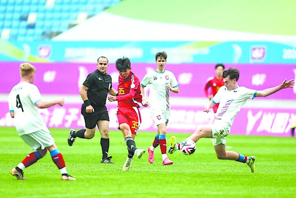 2024年國際中學生體育聯(lián)合會足球世界杯在遼寧省大連市舉行,中外球員角逐綠茵場。 遼寧省教育廳供圖