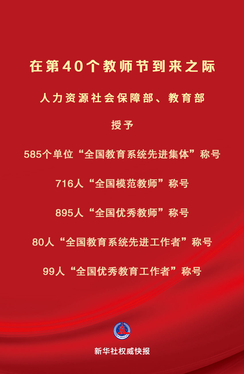 在中華人民共和國成立75周年和第40個教師節(jié)到來之際,為大力弘揚教育家精神,營造全社會尊師重教濃厚氛圍,激勵全國廣大教師和教育工作者落實立德樹人根本任務(wù),積極投身教育強國建設(shè),人力資源社會保障部、教育部決定授予中央財經(jīng)大學(xué)金融學(xué)院等585個單位“全國教育系統(tǒng)先進集體”稱號;授予刁榮春等716名同志“全國模范教師”稱號;授予于淵等895名同志“全國優(yōu)秀教師”稱號;授予王彥平等80名同志“全國教育系統(tǒng)先進工作者”稱號;授予王軍等99名同志“全國優(yōu)秀教育工作者”稱號。