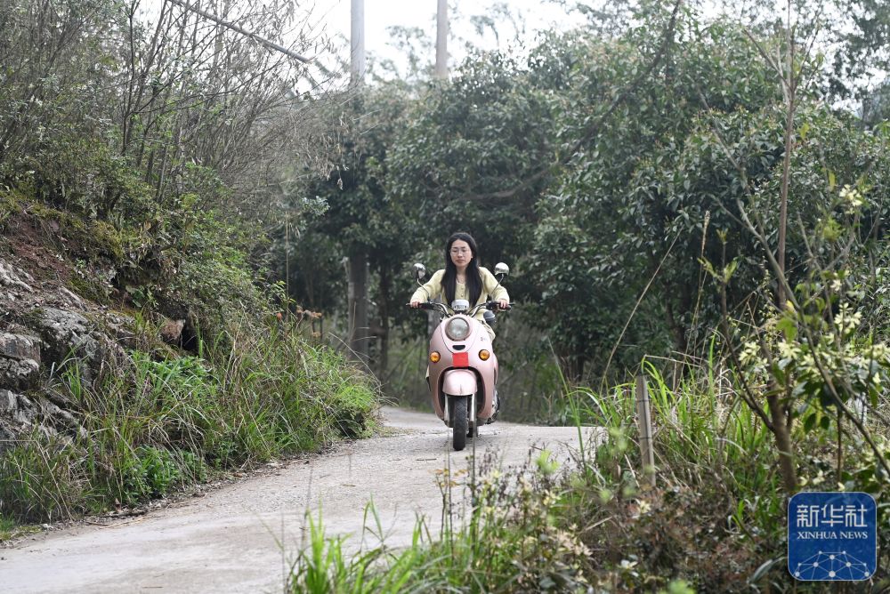 在廣西灌陽縣洞井瑤族鄉(xiāng)野豬殿村,“95后”老師趙艷騎著電動(dòng)自行車從學(xué)?;丶遥?024年3月27日攝)。