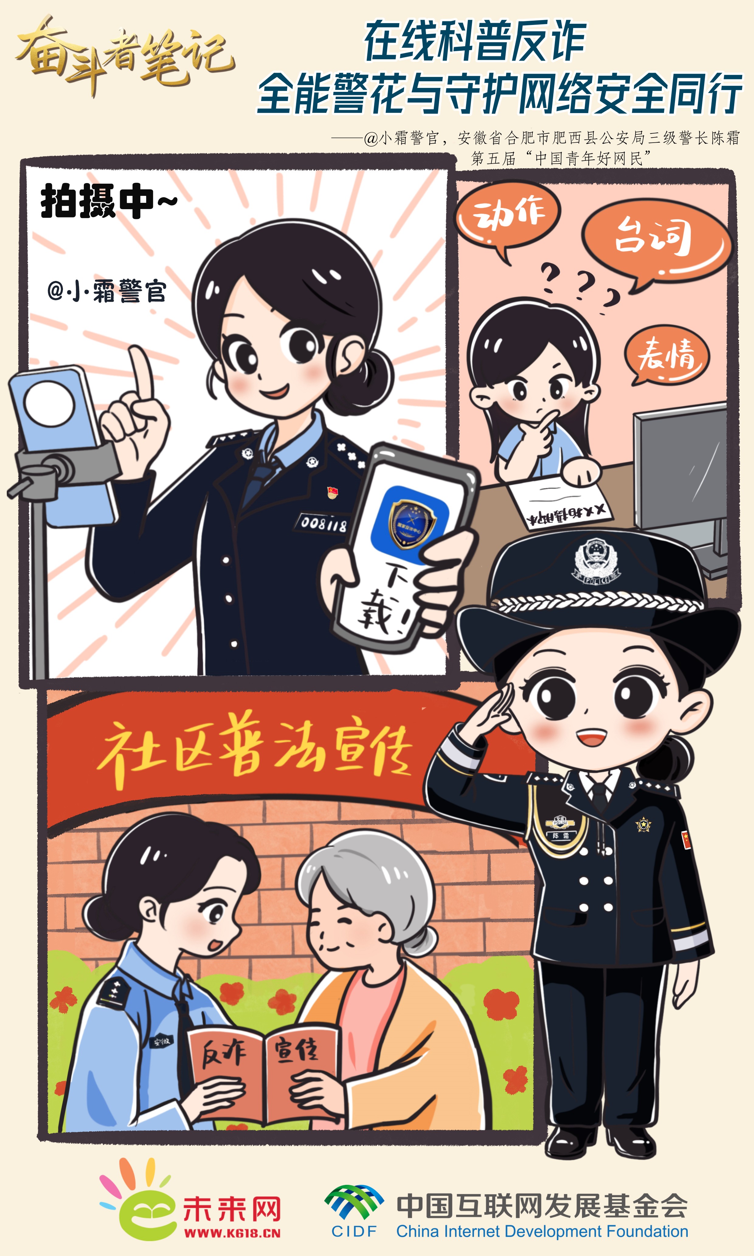 “一網(wǎng)情深”筑防線,心系百姓護(hù)安寧。面對(duì)在辦案過(guò)程中遇到的百姓養(yǎng)老錢(qián)、救命錢(qián)被騙的情況,陳霜愈發(fā)感到防范電詐和打擊電詐同樣重要。她創(chuàng)建“小霜警官”警務(wù)自媒體賬號(hào),認(rèn)真研究分析電信網(wǎng)絡(luò)詐騙的規(guī)律特點(diǎn)、思考防詐辦法,用大家喜聞樂(lè)見(jiàn)的形式為百姓普法、宣傳反詐知識(shí)。她還積極探索宣傳新路徑,緊跟時(shí)事熱點(diǎn),將防詐知識(shí)寫(xiě)成幽默風(fēng)趣的段子、引人入勝的故事和生動(dòng)的短劇。自2016年以來(lái),“小霜警官”累計(jì)推出了反詐、普法、便民等內(nèi)容原創(chuàng)短視頻500余個(gè),總粉絲量過(guò)800萬(wàn),全平臺(tái)播放量超50億。正如她的個(gè)性簽名所寫(xiě)——“一個(gè)特別接地氣的警察朋友”,親民的形象和接地氣的宣傳方式,讓她受到了廣大網(wǎng)友的關(guān)注和喜愛(ài)。