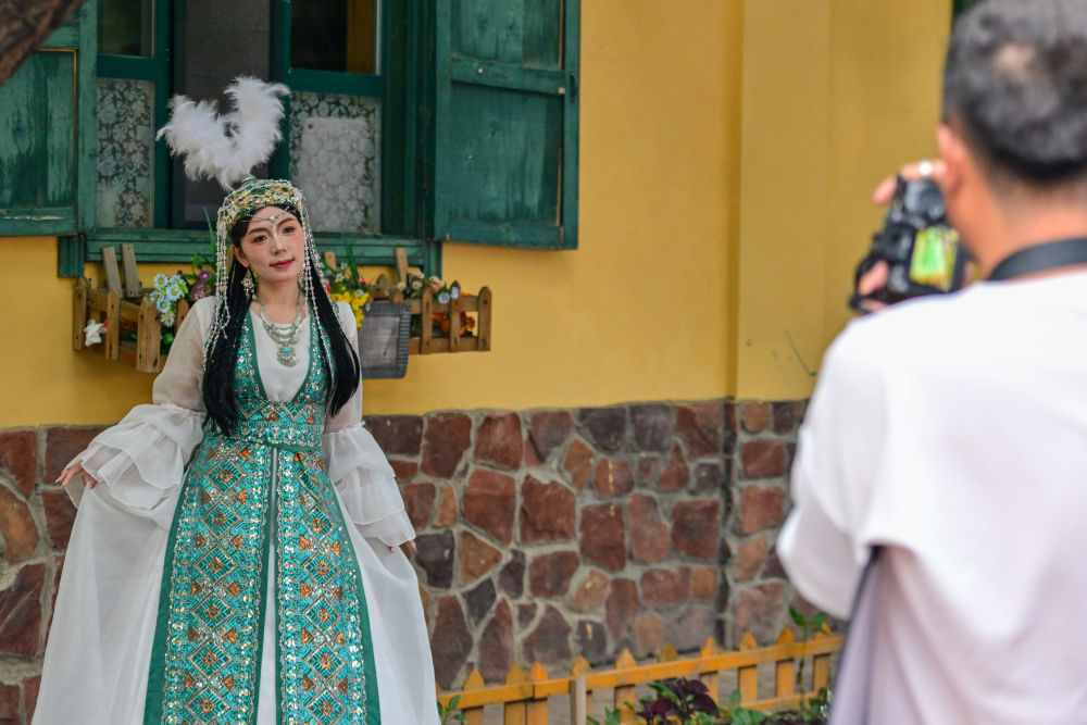 在新疆伊犁哈薩克自治州伊寧市六星街,游客體驗(yàn)旅拍項(xiàng)目。新華社記者 丁磊 攝