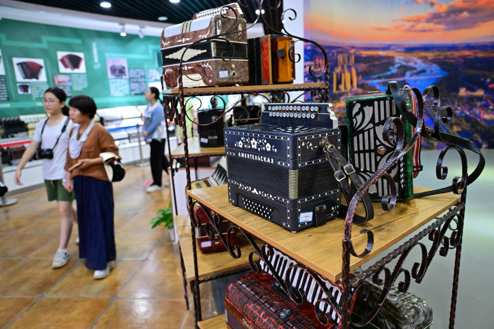 音樂(lè)舞蹈之所以在這里深受喜愛(ài),與多民族文化在此深度交流交融密不可分。六星街上有一座亞歷山大手風(fēng)琴珍藏館,800多架來(lái)自俄羅斯、意大利、德國(guó)、捷克等國(guó)的精品手風(fēng)琴在此靜靜陳列,其中不乏手風(fēng)琴中的“古董”珍品。這些手風(fēng)琴的主人亞歷山大·謝爾蓋維奇·扎祖林是國(guó)家級(jí)非物質(zhì)文化遺產(chǎn)——俄羅斯族“巴揚(yáng)(鍵鈕式手風(fēng)琴)藝術(shù)”非遺傳承人?!坝们俾曌層慰透惺艿搅墙值拿利愊楹褪俏业男脑??!眮啔v山大說(shuō)。