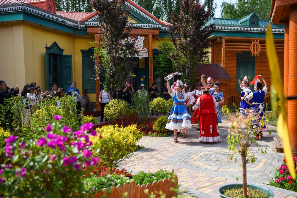 在新疆伊犁哈薩克自治州伊寧市六星街,當(dāng)?shù)鼐用裉鹞璧笟g迎遠(yuǎn)方來(lái)客。新華社記者 丁磊 攝