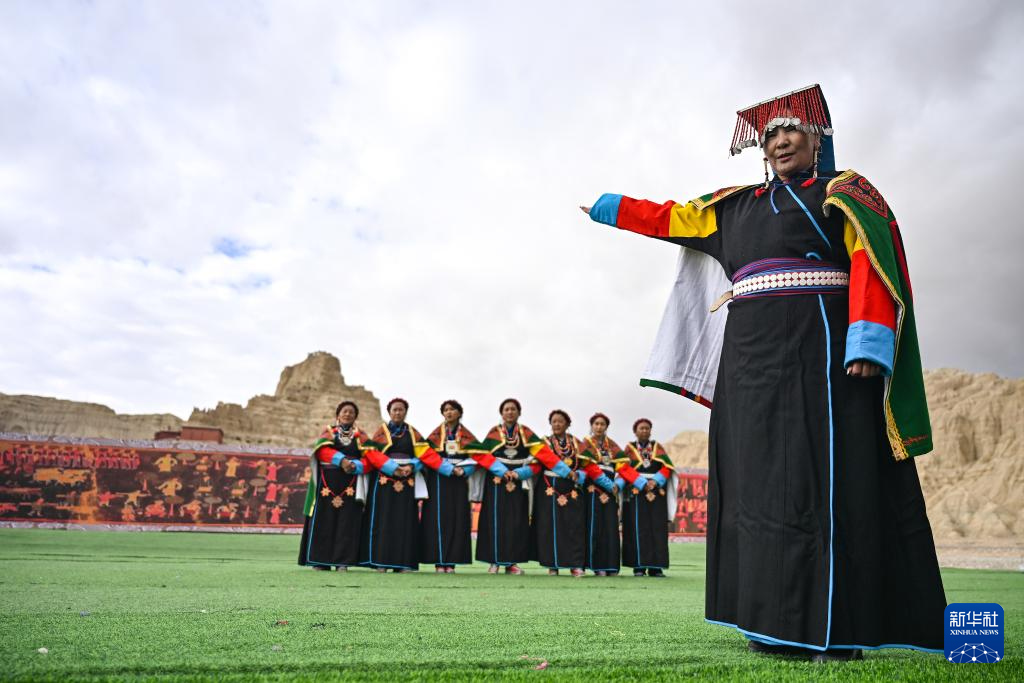 在西藏阿里地區(qū)札達縣古格王國遺址腳下,自治區(qū)級“宣舞”非遺傳承人央金(右)介紹“宣舞”(9月11日攝)。