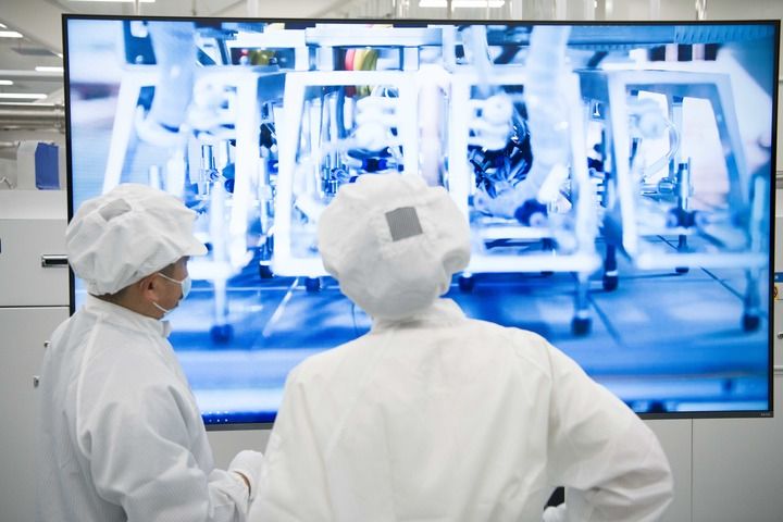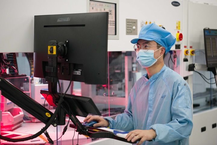 8月20日,在安徽華晟新能源科技股份有限公司的異質(zhì)結(jié)光伏電池及組件工廠內(nèi),工作人員在查看智能化產(chǎn)線運行情況。