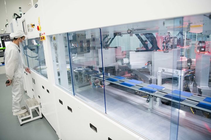 安徽合肥,全球單體產(chǎn)能最大的異質(zhì)結(jié)光伏電池及組件一體化工廠,工業(yè)機器人將一個個硅片投送到一架白色機器的腔體,經(jīng)過綿延的智能化流水線,狀如手機大小、薄如紙片的光伏電池片便下線了。