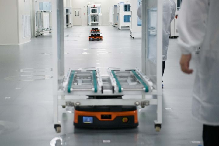 8月20日,在安徽華晟新能源科技股份有限公司的異質(zhì)結(jié)光伏電池及組件工廠內(nèi),搬運機器人在作業(yè)。