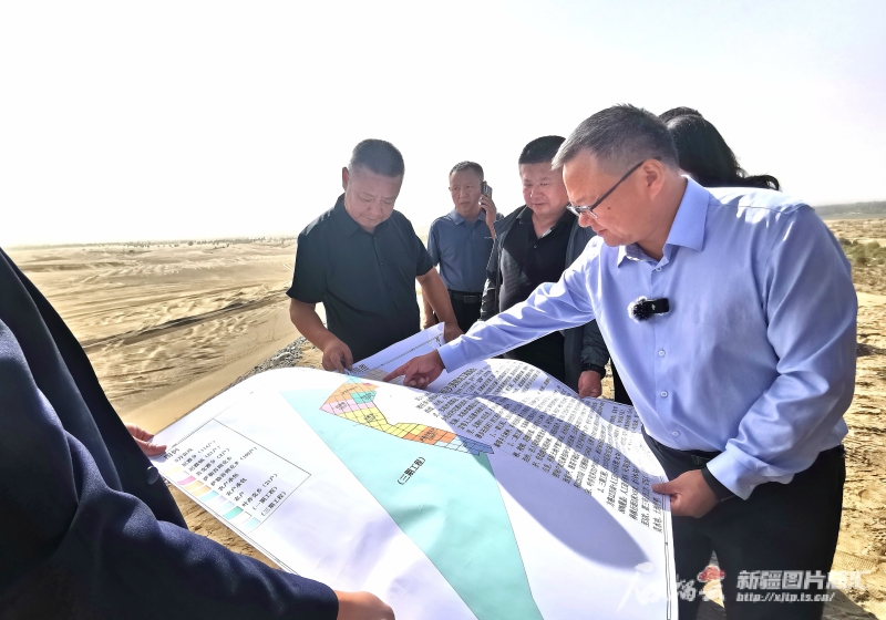 9月5日,民豐縣領導在治沙現(xiàn)場為記者介紹后河壩防沙治沙規(guī)劃。石榴云/新疆日報記者 曹華攝