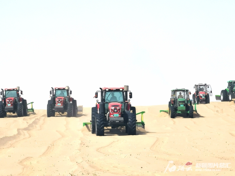 在后河壩二期治沙現(xiàn)場,亞森·奧斯曼聯(lián)合其他承包戶,集合了17輛拖拉機平整沙地。拖拉機一字排開向前推進,場面非常壯觀。