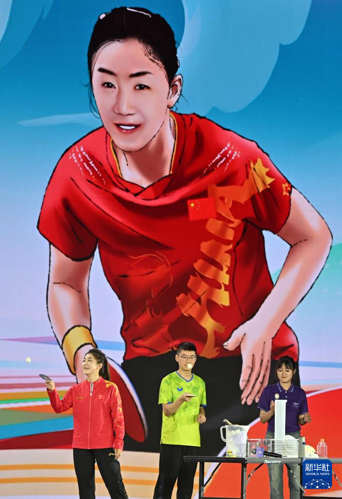 9月21日,奧運(yùn)冠軍陳夢(mèng)(左一)在臺(tái)上和學(xué)生互動(dòng)。新華社記者 李然 攝