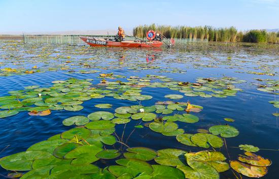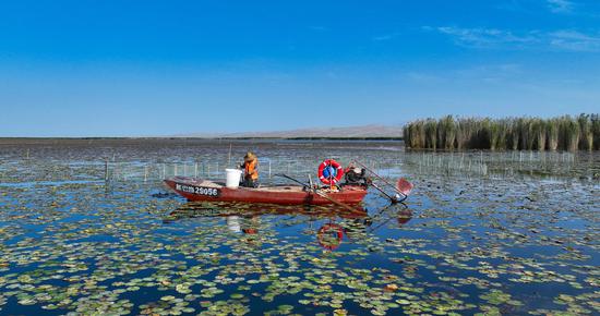 金秋時(shí)節(jié),位于新疆維吾爾自治區(qū)巴音郭楞蒙古自治州博湖縣境內(nèi)的博斯騰湖的螃蟹迎來(lái)豐收季,波光粼粼的湖面上,穿梭的漁船與蘆葦、睡蓮、沙漠構(gòu)成一幅生動(dòng)的秋日畫(huà)卷。