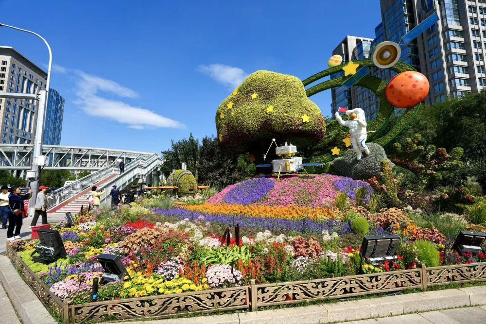 圖為9月25日拍攝的長(zhǎng)安街沿線建國門西北角“普天同慶”花壇。新華社記者 鞠煥宗 攝