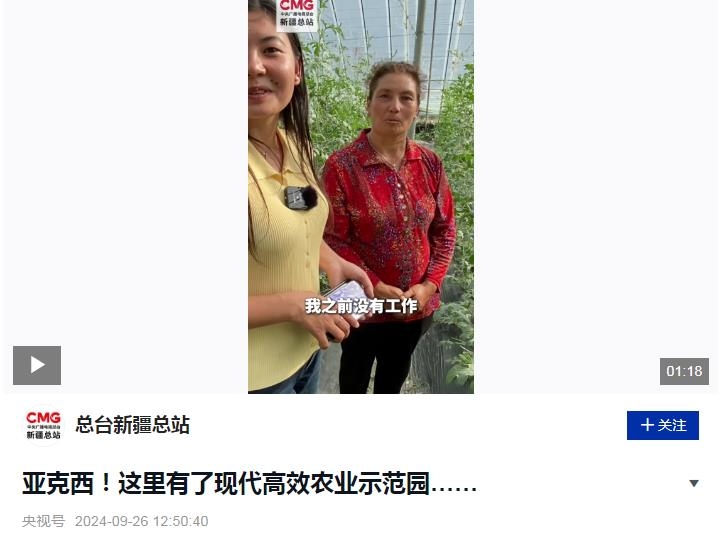 阿依謝姆古麗,在新疆喀什地區(qū)疏勒縣的山東省援疆項目“蔬樂”現代高效農業(yè)示范園,從事西瓜種植工作已經兩年了?!白鳛檗r民的她,之前沒有收入?!闭劦竭@份工作,阿依謝姆古麗激動得熱淚盈眶。