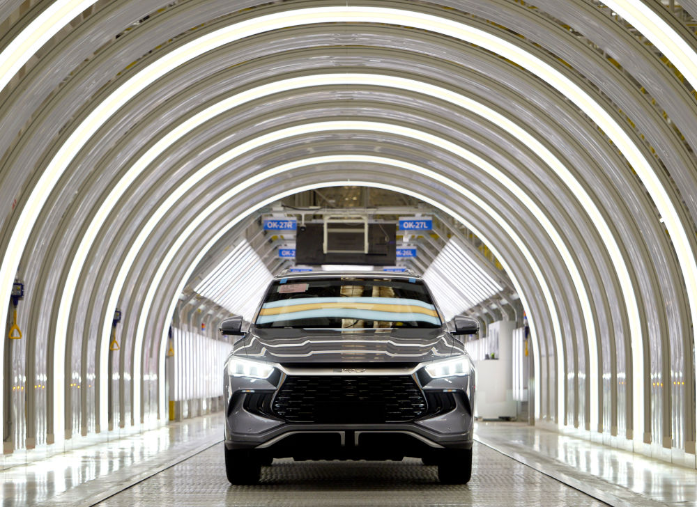 4月25日拍攝的鄭州航空港區(qū)比亞迪總裝工廠(chǎng)新能源汽車(chē)“宋Pro”生產(chǎn)線(xiàn)。新華社記者 李嘉南 攝