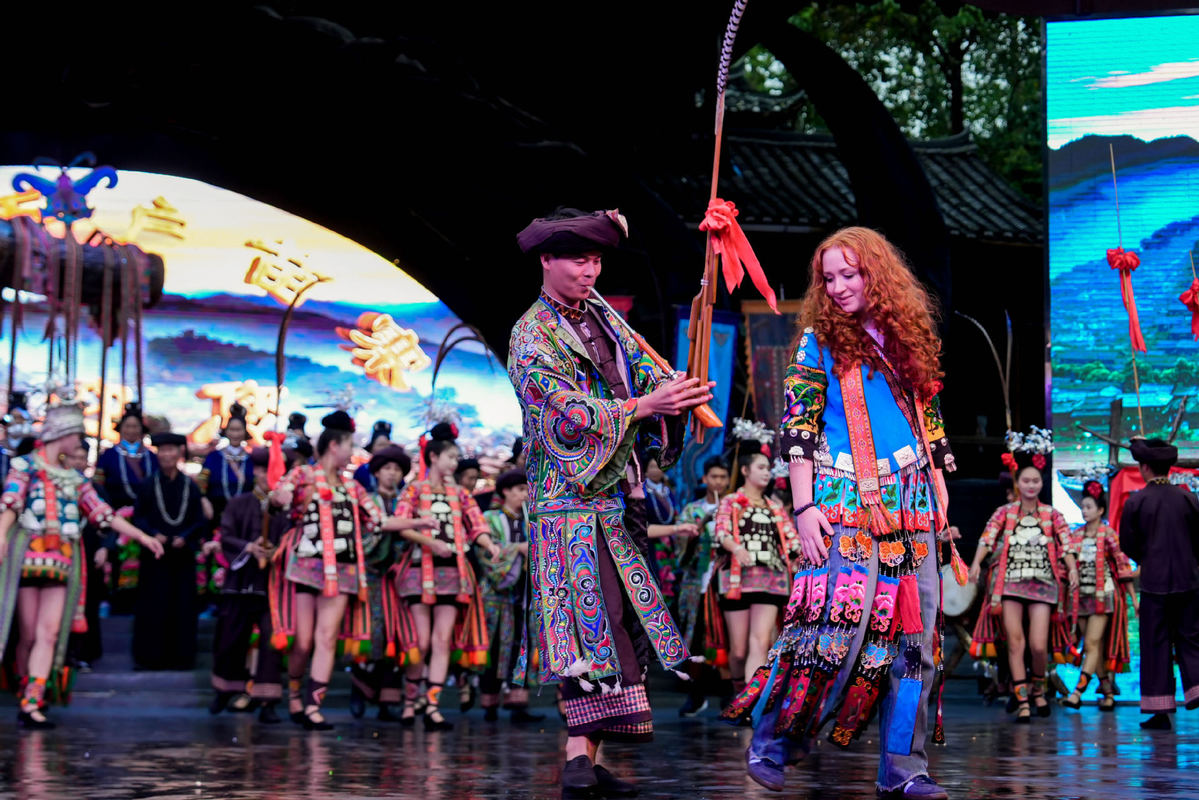 9月16日,美國青年學生在貴州省西江千戶苗寨體驗民族歌舞。(圖片來源:新華社)