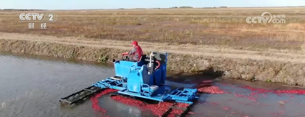 成熟的蔓越莓怎么收獲呢?轉(zhuǎn)過來看這里,這就是記者所說蔓越莓的地塊為什么像池塘,因為這里灌進(jìn)水,工作人員就駕駛著采收機(jī)就可以收獲了,采收機(jī)上有兩排鋼條,它能將水里的蔓越莓從植株上脫落下來。因為蔓越莓里面是空心的,所以能夠浮在水面上。我們看,采收機(jī)走過之后,后面的蔓越莓就漂上來了。工作人員只需要來回多次的行駛,就可以把成熟的果子都收獲下來,這種方式收獲率可以達(dá)到97%以上。每個地塊都這么大,飄在水上的蔓越莓怎么才能收回來呢?工作人員在水里用木板把這些蔓越莓聚攏到一起,再通過提升機(jī)就可以裝到車廂里了。每到蔓越莓收獲的季節(jié),田里就變成了紅色的海洋,非常漂亮。