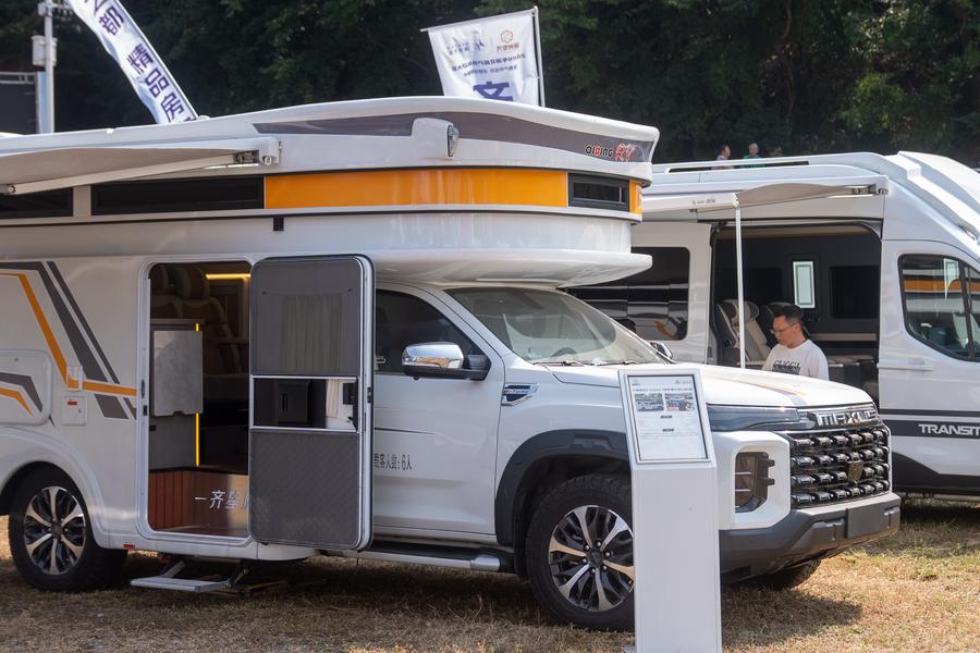 9月28日,參觀者在戶外運(yùn)動(dòng)裝備展上參觀房車(chē)。新華社記者 杜子璇 攝