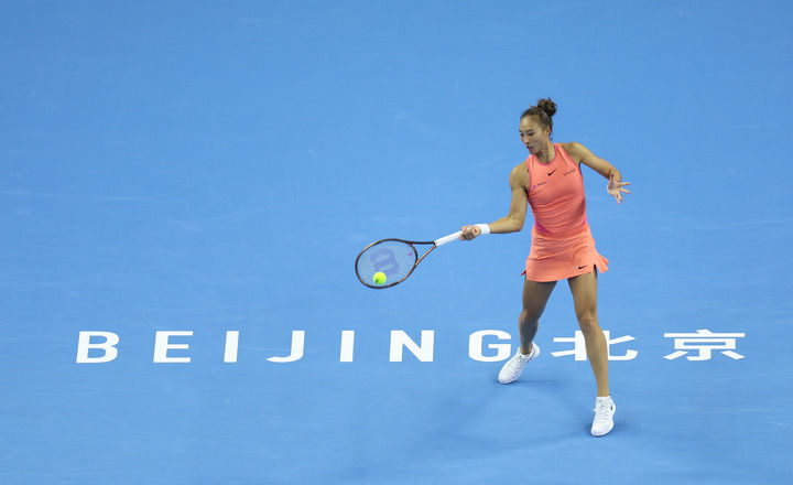 10月2日,鄭欽文在比賽中回球。當日,在北京進行的2024中國網(wǎng)球公開賽女子單打第四輪比賽中,中國選手鄭欽文2比1戰(zhàn)勝美國選手阿尼西莫娃,晉級八強。新華社發(fā)(杜昕怡攝)