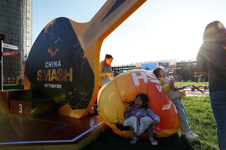 10月1日,孩子們在大滿貫公園玩耍。當日,2024年世界乒乓球職業(yè)大聯(lián)盟(WTT)中國大滿貫比賽繼續(xù)在北京進行。新華社記者 王麗莉 攝