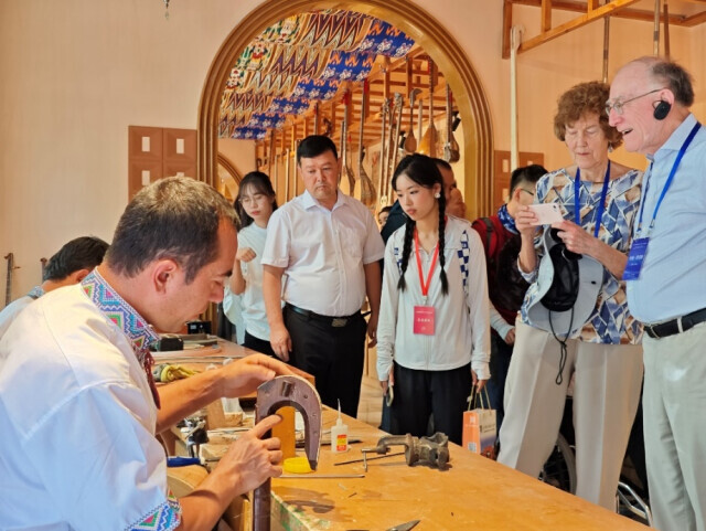 ▲2024年6月,“中國新疆的歷史與未來”國際論壇的外國專家在疏附縣“中國新疆民族樂器村”考察。中國民族報記者李翠攝