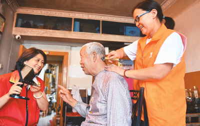 河南省洛陽(yáng)市澗西區(qū)積極構(gòu)建“嵌入式”養(yǎng)老服務(wù)體系,為老年人提供養(yǎng)老助餐、社區(qū)娛樂、健康管理、上門保潔等綜合養(yǎng)老服務(wù)項(xiàng)目,讓老人在家門口享受全方位養(yǎng)老。圖為澗西區(qū)武漢路街道秦嶺路社區(qū),養(yǎng)老服務(wù)中心護(hù)理員和社區(qū)志愿者為居家老人理發(fā)。黃政偉攝(人民視覺)