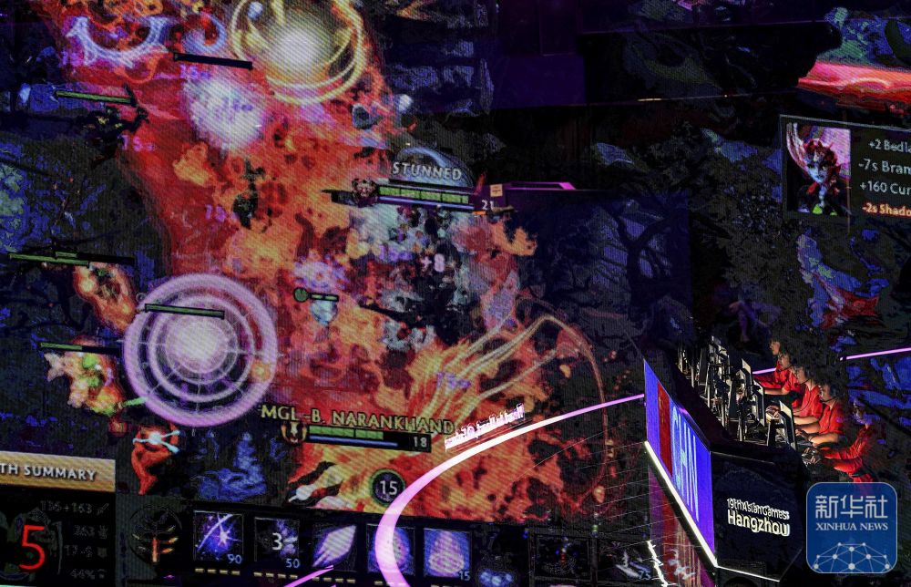 2023年10月2日,中國隊(duì)選手在比賽中(多重曝光照片)。 當(dāng)日,在杭州亞運(yùn)會(huì)電子競技項(xiàng)目刀塔決賽中,中國隊(duì)以2比1戰(zhàn)勝蒙古國隊(duì),獲得冠軍。 新華社記者 顏麟蘊(yùn) 攝
